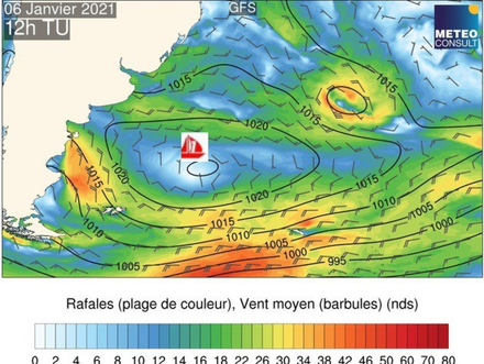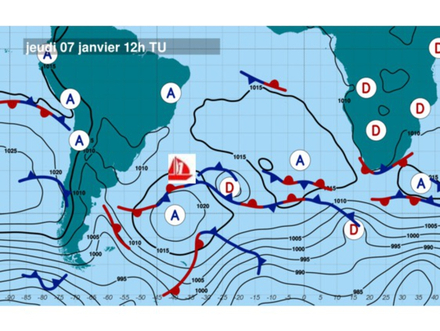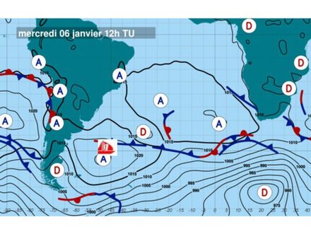 Ce mardi 5 janvier, la situation deviendra moins favorable pour le leader Yannick Bestaven. Dans sa remontée vers le nord, il subira un vent de plus en plus faible en se rapprochant du centre de l’anticyclone installé dans le nord des îles Falkland. L’objectif sera de trouver le petit trou de souris entre les deux anticyclones pour ne pas se retrouver piéger sous la molle anticyclonique et conserver un peu d’air…