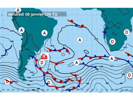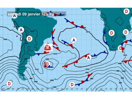 Ce jeudi, le trio de tête de la course se situera dans un couloir de vent soutenu entre l’anticyclone situé dans le nord-est des Falkland et une dépression évoluant au large de l’Argentine. Le vent s’établira au nord-est pour une vingtaine de nœuds. La troupe des poursuivants qui évoluera dans l’est des îles Falkland naviguera à vive allure dans un vent de nord-ouest soutenu en bordure de l’anticyclone.