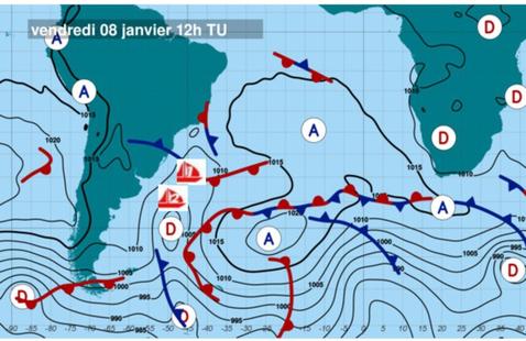 La dépression m’a accompagnée encore 4-5 heures après la longitude du Cap Horn, je voulais plutôt aller le long de la ZEA (zone d’exclusion Atlantique) car j’avais en tête de rester assez Est en vue de l’anticyclone que j’ai passé hier. Le vent a alors tourné à l’Ouest, ce qui m’a fait faire une trajectoire un peu plus Nord que prévu, je me suis retrouvé dans le dévent du Cap Horn, qui porte très loin, jusqu’à 200-300 milles. La première nuit dans ce dévent, je t’avoue que je n’ai pas cherché à empanner, car j’étais comme un boxeur un peu sonné, j’avais été bien rincé par cette dépression, il faut un peu de temps pour reprendre ses esprits, tu ne passes pas tout d’un coup de trois ris-J3 à grand-voile haute et gennaker. Finalement, en fin de nuit, je me suis dit que si je voulais aller à l’Est, il fallait que je sorte de là, donc j’ai empanné, mais je suis resté sous voilure réduite, car j’avais pas mal de choses à réviser à bord avant de relancer de la toile devant. J’ai donc perdu un peu de temps, mais ça m’a permis de checker le bateau, de remettre tout en ordre, et je pense que j’ai perdu un peu moins de temps que Charlie (Dalin, Apivia) qui avait lui aussi des réparations à faire. Depuis, j’ai repris cette stratégie que je m’étais fixée de rester bien à l’Est.