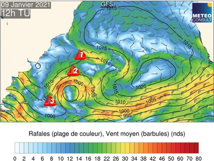La carte de champ de vent de ce samedi 9 janvier à la mi-journée confirme la large zone de vents faibles située devant les côtes brésiliennes et argentines. Avec une telle situation, les nerfs des marins seront mis à rude épreuve. Il leur faudra sans doute guetter la moindre risée sur le plan d’eau pour pouvoir progresser.