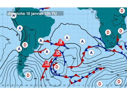Le trio de tête évolue à l’est de l’anticyclone centré au large des côtes brésiliennes. Leur objectif est de rester suffisamment à l’est de celui-ci pour bénéficier des vents de sud-ouest en bordure. Dans ce contexte, C.Dalin et T.Ruyant devraient continuer de réduire leur écart avec Y, Bestaven en bénéficant de vents de sud-ouest un peu plus soutenus. Ces vents seront plus forts pour les poursuivants du groupe 2. La tête du groupe 3 devrait arriver dans le sillage de cette même dépression mais au sud de celle-ci.
