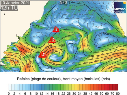 Les vents devraient devraient considérablement faiblir pour le trio de tête avec à peine 8 à 10 nœuds, ce qui les ralentira dans leur progression. En revanche, les navigateurs du groupe 2 pourraient diminuer les écarts avec la tête grâce à des vents portants de sud-sud-ouest autour de 15 nœuds. Le groupe 3 évoluera dans le flux de sud-ouest à l’avant de la dépression avec des vents moyens de 20 nœuds et des rafales supérieures à 30 nœuds.