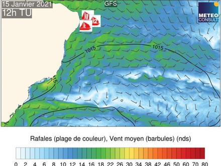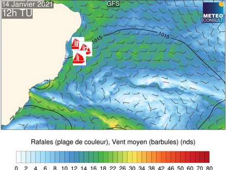La carte de champ de vent montre bien la rotation progressive du vent de l’est vers le nord-est. Avec ce vent qui adonnera (vent qui s’écarte de l’axe du bateau), les vitesses de navigation accéléreront.