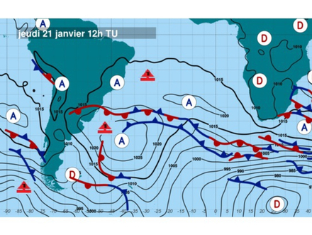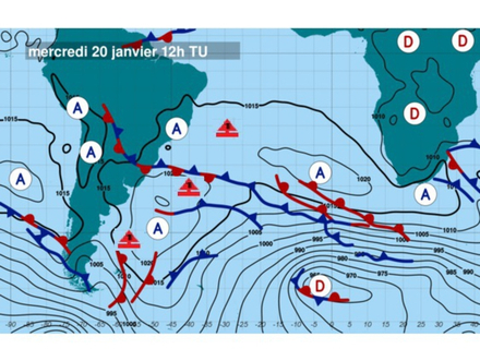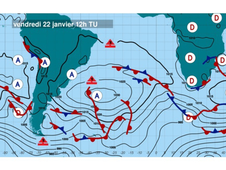 Plus au sud, entre les 14 ème et 20 ème concurrents, on naviguera dans un alizé d'est parfois interrompu par des périodes de calmes liées à plusieurs bulles anticycloniques, vestiges de l'anticyclone de Sainte Hélène complétement éclaté. Et enfin, entre le 22ème et 25ème, on passera entre le Cap Horn et le large de l'Argentine dans des conditions parfois musclées au grè des dépressions du grand sud qui évoluent dans ces parages.