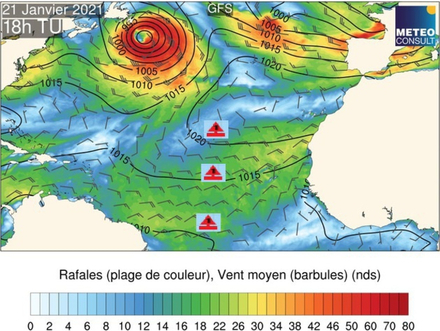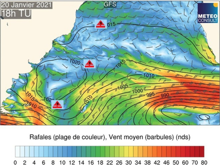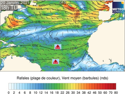 Les premiers approcheront le célèbre anticyclone des Açores, qui sera situé plutôt bas en latitude, à 1026 hPa dans l'ouest des Canaries, au sud de l'archipel des Açores. L'objectif des skippers étant de contourner cet anticyclone par son flanc ouest et de toucher ainsi un flux de secteur est, tournant lentement au sud-est puis sud. Les bateaux seront freinés mais peut-être pas durablement. Notons que dans leur remontée vers le nord, et malgré la présence du calme anticyclonique, les skippers toucheront une grande houle de secteur ouest à nord-ouest (montant à 4 m), générée par le train des dépressions très creuses circulant sur l'Atlantique nord, assez bas en latitude, au niveau du 45 ème nord, c'est à dire entre le sud de La Nouvelle-Ecosse et le Golfe de Gascogne.