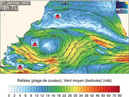 Enfin, plus à l'arrière, on continuera à remonter plein nord en retrouvant des alizès assez faibles mais plutôt réguliers de secteur Est, au large du Brésil. Le Pot au Noir sera réduit à peau de chagrin, ce qui devrait en faciliter sa traversée.