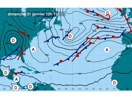 La tempête Justine que l’on voit bien positionnée au sud de l’Irlande à 12TU se dirige l’après-midi vers la mer d’Iroise. La carte de situation nous montre également une autre tempête sur l’Atlantique Nord alors que l’axe de hautes pressions à l’ouest des Canaries pivote vers une orientation nord/sud au lieu de sud-ouest/nord-est la veille.