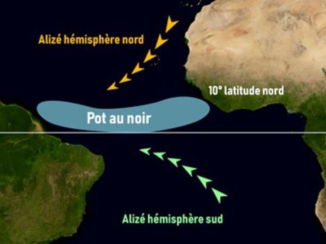 Le Pot au Noir correspond à une zone intertropicale très instable où les conditions météo peuvent changer rapidement dans le temps et l’espace, ce qui peut surprendre et mettre les nerfs des marins à rude épreuve. C’est dans cette zone proche de l’équateur que se rencontrent les alizés de nord-est dans l’hémisphère Nord et ceux de sud-est dans l’hémisphère Sud. Cette zone de convergence des vents est propice à la formation de gros cumulonimbus, ces nuages à fort développement vertical à l’origine de fortes pluies orageuses et de vents violents. Dans les parages de ces nuages, le vent peut passer brutalement d’une dizaine de noeuds à une quarantaine de noeuds. Les marins doivent donc scruter le ciel et se préparer à des manoeuvres et rapides réglages de voiles lors de l’arrivée du phénomène. Certains habitués n’hésitent pas à analyser les images satellites et trouver la moindre opportunité pour traverser cette zone le plus rapidement possible. C’est souvent celui qui trouvera le trou de souris entre les zones de turbulence qui tirera son épingle du jeu. Dans leur descente de l’Atlantique, la plupart des marins cherchent à se décaler dans l’ouest puisque le Pot au Noir est y est plus étroit qu’à proximité du continent africain.