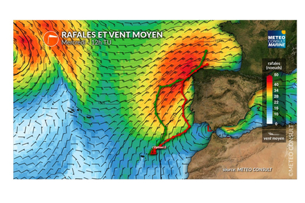 Le peloton est un peu dispersé, avec un avantage pour ceux qui sont les plus avancés vers le cap Finisterre, où le vent se renforce par effet de compression sur la côte. Léger avantage également pour les sudistes, qui sont allés chercher un peu plus de pression dans les voiles au large des côtes de la Cantabrie. Tous se dirigent vers le fameux cap, avec le choix d’un passage près de la côte ou au large de la Zone de Séparation de Trafic, interdite à la navigation. Devant le cap, on attend jusqu'à 30 noeuds de vent, avec des rafales atteignant 40 noeuds. Il faudra faire preuve de prudence dans le choix des voiles...