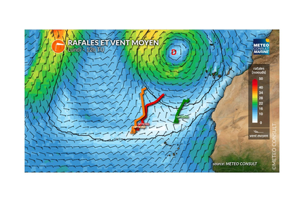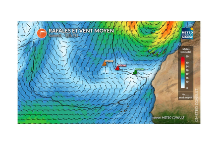 Pour Jean Le Cam (Option 1) qui navigue très à l’est du plan d’eau, l’arrivée du front froid devrait lui permettre de retrouver un peu plus de vent que la veille. Le vent de nord-ouest lui permettra de remettre un peu d’ouest dans sa route mais sa progression restera plus faible que ses concurrents qui conserveront un peu plus d’air. Les partisans de la route ouest (Option 3) pourraient devancer les partisans de la route médiane (Option 2) en ayant profité d’un vent de nord un peu plus tonique. Mais rien n’est joué puisqu’une nouvelle zone de transition s’annoncent en progressant vers le sud avant de pouvoir rejoindre la route des alizés au niveau de la latitude du Cap Vert.