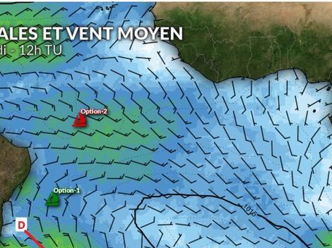 L'option 1 repose sur la trajectoire de Charlie Dalin (MACIF Santé Prévoyance), leader actuel, qui a été le premier à amorcer le virage vers le cap de Bonne-Espérance. Les concurrents en tête profitent d’un vent de 15 noeuds qui tourne rapidement au nord, leur permettant de filer plein sud-est à près de 20 noeuds. Cette vitesse leur offre une belle opportunité de s'accrocher à la dépression se détachant idéalement de la côte brésilienne, leur garantissant des conditions favorables pour plusieurs jours.