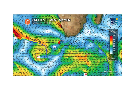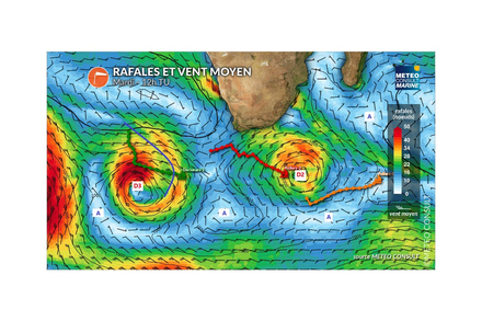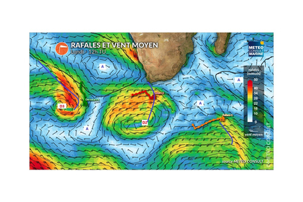 Les foilers de tête auront à choisir entre le gain vers des latitudes plus nordiques en pariant sur la rapide arrivée de la dépression suivante, ou le gain vers le Sud pour rester le plus longtemps possible dans le flux d’Ouest dans le sillage de la dépression D1, sachant que ces latitudes seront bientôt balayées par de forts coups de vent.