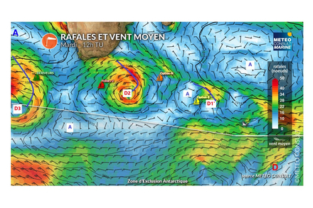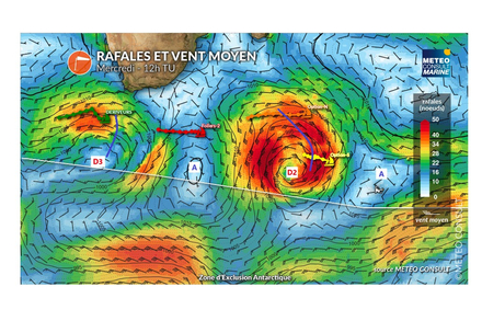L’option Sud pour Charlie Dalin et Sébastien Simon consiste à continuer sur la route directe pour fuir au plus vite la dépression D2 qui arrive en se creusant rapidement.
