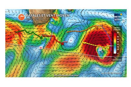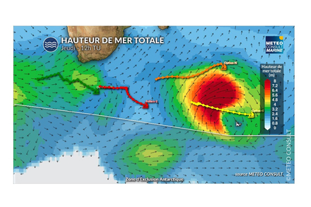 On espère que les tenants de l’option Sud arriveront à maintenir la cadence pour ne pas se faire rattraper par le centre dépressionnaire. Ils seraient alors stoppés en ne pouvant plus éviter le couperet de la tempête de sud-ouest à venir. Dans cette tempête les vagues dépasseront 10m de hauteur moyenne et cela déferlera dangereusement.