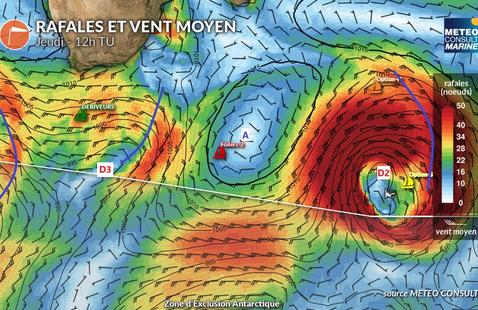Voilà pour le groupe « Kerguelen » et les garçons. Car si nos marins n’ont que peu de temps pour nous envoyer des cartes postales, ils ont la sympathie de nous faire réviser notre géographie. Au Nord, c’est en effet les cailloux de Saint-Paul et Amsterdam, sortis de mer voilà près de 100 000 années, que nos marins vont approcher. Yoann Richomme (PAPREC-ARKÉA, 3e) en tête, qui bataille déjà avec 7 mètres de vague selon les fichiers, suivi, 80 milles derrière, par Thomas Ruyant (VULNERABLE, 4e). Pour tout ce paquet, qui s’étire plus Sud jusqu’à Paul Meilhat (Biotherm, 8e) et Yannick Bestaven (Maître CoQ V, 9e), c’est l’état de la mer qui va leur faire vivre une épreuve qu’on ne souhaite pas à grand monde, puisque, déjà, ils sont croqués par l'anticyclone derrière la dépression.