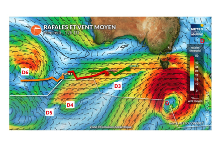 Flotte-3 : Boris Hermann et ses 3 concurrentes féminines devront passer une dorsale avec des vents qui faibliront nettement. Ils perdront donc un peu de terrain mais une nouvelle dépression arrive par l’ouest et devrait leur permettre de reprendre de la vitesse en fin de journée.