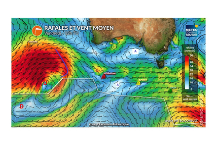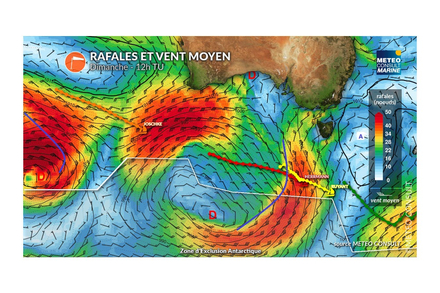 Charlie Dalin en a enfin terminé avec ses empannages le long de la ZEA. Il peut entamer un grand bord au sud-est. Ses poursuivants ont encore quelques bords à tirer mais ils sont rapides dans un vent d’ouest bien établi. Thomas Ruyant s’est fait happé par une dorsale dont il a peu de chance de s’extraire avant de longues heures. Ses poursuivants le rejoignent. Boris Hermann profite aussi de conditions plutôt favorables avec un vent orienté au nord-nord-ouest.