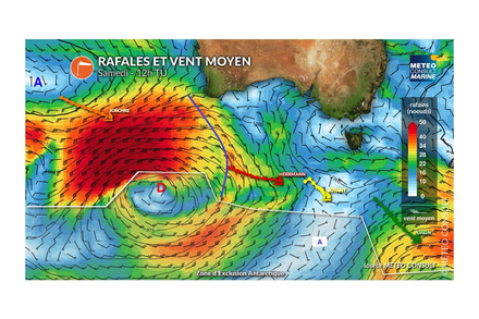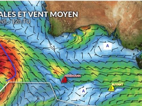 Sur son option Sud, Tanguy Le Turquais, proche du centre de la dépression, évite le plus fort mais subit tout de même un vent de 35 noeuds et des vagues de 6 mètres.