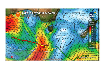 Thomas Ruyant et ceux qui l’ont rejoint sont aux prises avec les calmes de la dorsale. Le gros de la flotte des foilers doivent se regrouper sur cette barrière.