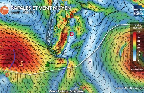 Les dépressions très creuses qui se succèdent dans cette région rendent les conditions de vent et de mer très particulièrement compliqués. Les skippers doivent jongler entre des vents violents avec de soudains changements de direction, imposant une vigilance permanente. De plus, la faible luminosité, due aux fréquents ciels nuageux, accentue la fatigue visuelle et mentale. Les grains, accompagnés de fortes précipitations, peuvent réduire la visibilité à quelques centaines de mètres, rendant ce passage encore plus intimidant.