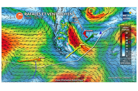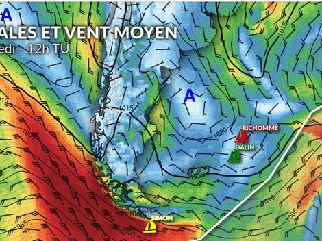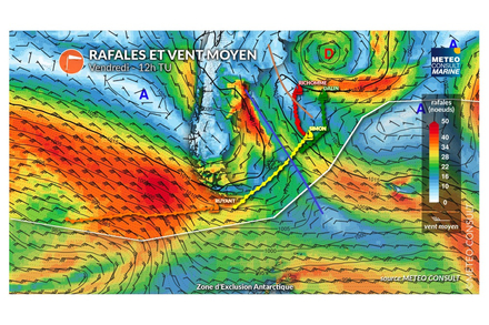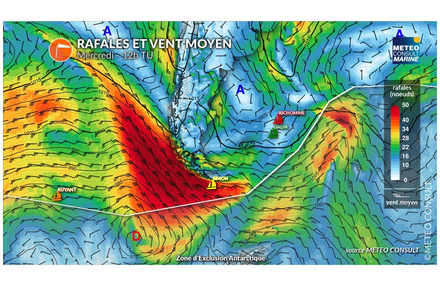 Très difficile pour chacun des deux leaders de choisir sa route. Il s’agit de croiser l’anticyclone qui, provenant des côtes argentines, se déplace vers le sud-est et s’étale devant eux. Pour l’instant Yoann Richomme, 100MN plus au nord que son concurrent, est dans un vent portant de 7 à 8 noeuds sur la bordure orientale de la cellule anticyclonique. Il peut choisir de s’approcher en tribord amure de la frontière de la ZEA ou de partir vers le nord-ouest vers le centre de l'anticyclone. Dans le premier cas c’est avancer à court terme mais risquer d’être enseveli sous l’anticyclone demain. Dans l’option Ouest, il subira plus tôt la « pétole » mais probablement moins longtemps.