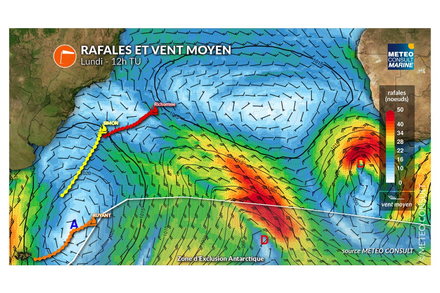 Ce lundi Charlie Dalin et Yoann Richomme traverseront une zone de vent faibles et irréguliers de secteur nord-ouest, entre 10 et 15 noeuds, ce qui les ralentira dans leur progression. Sébastien Simon connaitra également de faibles conditions de secteur sud-est, entre 10 et 15 noeuds, ce qui le ralentira par rapport à la veille. Enfin, Yannick Bestaven, naviguera toujours sous un flux de nord-ouest d’une quinzaine de noeuds.