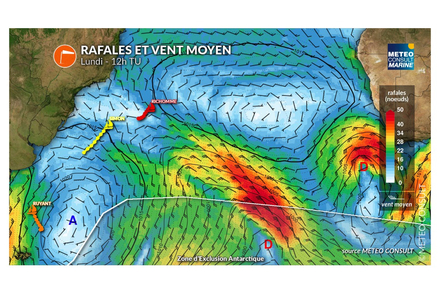 Ce lundi, pour Yoann Richomme et Charlie Dalin, le vent virera au nord-nord-ouest et forcira autour de 10-15 noeuds en journée avant de refaiblir en soirée. Thomas Ruyant retrouvera enfin un flux de nord-est bien établi à l’avant d’un front froid au large des côtes argentines. Yannick Bestaven devrait choisir une option très ouest, le long de l’Argentine, afin d’éviter les faibles conditions de vent sous l’anticyclone.