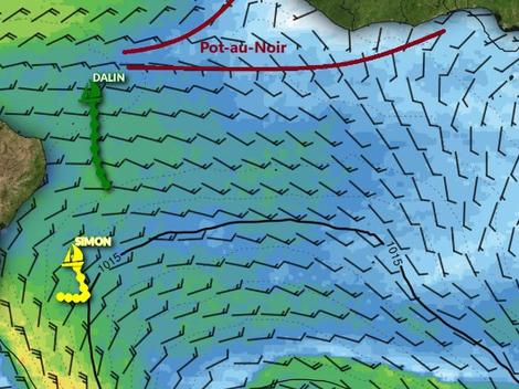Sébastien Simon doit aller vite et bien dans le vent d’est. Attention tout de même à ne pas passer trop près de la côte où des effets de tampons cassent l’alizé.