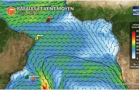 «Soit on tente sa chance près de la côte en se disant qu’on fait une route plus directe mais avec peut-être moins de vent, ou alors on se dit qu’on fait le tour au large, en rallongeant la route, mais en ayant une zone difficile moins large à traverser, et dans un deuxième temps, quand on a traversé ce front, on bascule dans les alizés, c’est-à-dire le vent qui va basculer au Nord, puis Nord-Est, puis à l’Est. Donc le fait d’aller au large permet aussi de jouer cette rotation du bon côté ! Mais ça nécessite de faire de la route, et on n’est jamais à l’abri de finalement être arrêté en cours de route un peu plus que prévu dans ce front semi-permanent potentiellement orageuse !» Nicolas Lunven, HOLCIM - PRB.