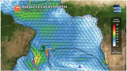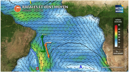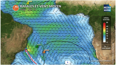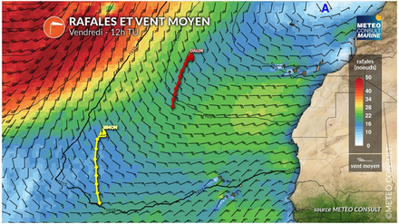 Les deux leaders sont « sauvés ». Ils voient leur vent de sud-est s’orienter peu à peu vers le sud en se renforçant. Ils doivent frôler l’extrémité est de la zone interdite destinée à la protection de la biodiversité qui entoure les Açores. Cette route imposée peut être une plus forte contrainte pour Yoann Richomme que pour Charlie Dalin puisque la route de Yoann se trouve légèrement plus à l’ouest que celle de Charlie.