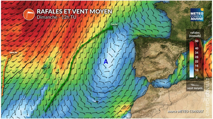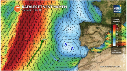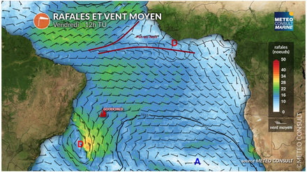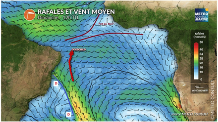 Sébastien Simon contourne par l’ouest la zone interdite qui englobe l’archipel des Açores. Sur cette option il trouvera un flux d’ouest puissant mais il lui faut d’abord croiser le front qui s’annonce dur avec 45 noeuds en rafales.