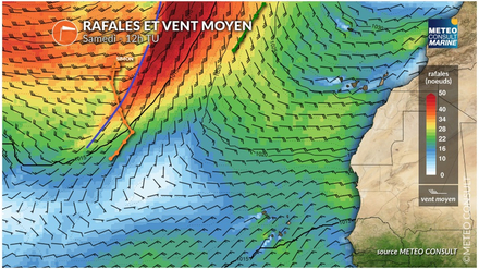Les poursuivants remontent au près dans un alizé de plus en plus favorable. Leur vent tourne progressivement à l’est.