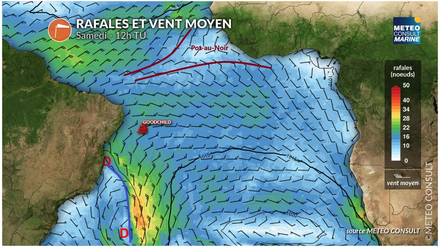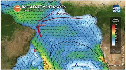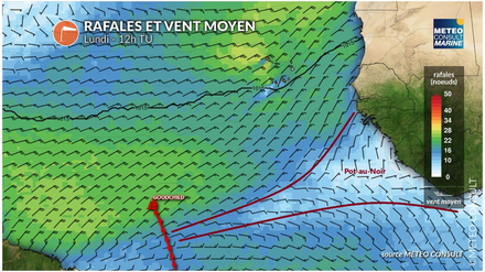 Charlie Dalin file à 22 noeuds dans un vent de sud 20 noeuds. Son cap le plus abattu (le plus vent arrière possible) l’amène au mieux au 035°, un peu trop au nord-est pour rester dans les vents assez forts puisque l’anticyclone et ses vents mous sont sur son est. Il sera donc souhaitable de caler rapidement un petit contre-bord, 2 heures de bâbord amure pour aller chercher « un peu plus de pression » ce que ne manquera pas de faire son menaçant poursuivant, Yoann Richomme, qui n’est plus qu’à 140MN derrière lui.