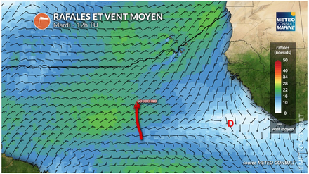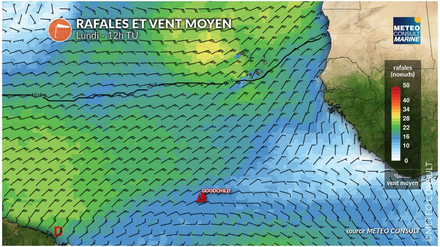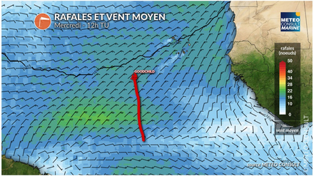 Sam Goodchild continuera de progresser dans l’alizé de nord-est qui perdra un eu de vigueur dans sa remontée vers le nord. Il devra peaufiner sa trajectoire pour retrouver le plus vite possible des vents portants à l’avant des dépressions de l’Atlantique Nord.
