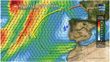 Sébastien Simon incurvera sa trajectoire vers le nord du golfe de Gascogne, sous un vent de sud-sud-est qui perdra un peu de sa vigueur. Comme il aura un meilleur angle au vent en s’écartant de l’axe du vent, il poursuivra sa navigation tribord amure à bonne vitesse.