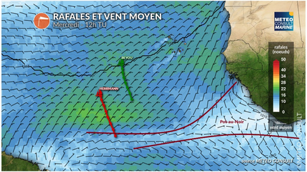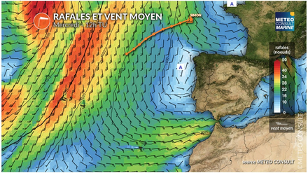 Sébastien Simon doit pouvoir repartir en bâbord amure avant d’être proche de la côte où les vents seront encore plus faibles. Il faudra compter sur moins de 10 noeuds de vent dans la nuit pour s’approcher des Sables d’Olonne.