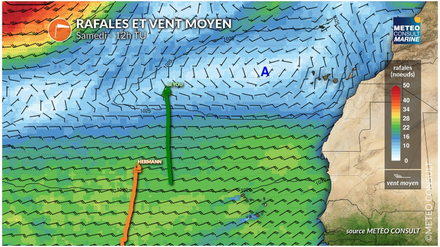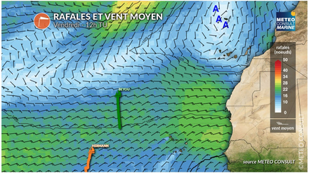 Ce vendredi, Jérémie Beyou sortira progressivement du domaine des alizés et n’aura d’autre choix que de traverser une dorsale pour aller rejoindre un nouveau vent de sud-sud-ouest à l’avant d’un vaste système dépressionnaire au coeur de l’Atlantique Nord. Il va donc nettement ralentir sa course sous l’effet d’un vent d’est faiblissant à l’approche de la dorsale.