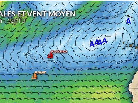 Thomas Ruyant navigue encore dans l’alizé au sud de la dorsale anticyclonique. Il progresse encore vite et peut lui aussi incurver sa trajectoire vers la droite avec l’alizé qui vire à l’est. Il rattrape un peu de terrain sur les concurrents qui sont devant, dans la dorsale.