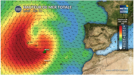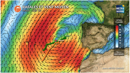 Pour garder le plus longtemps possible un vent portant à l’avant de la dépression, Jérémie Beyou, Sam Goodchild et Paul Meilhat n’auront d’autre choix que de progresser sur une route très à l’est qui les emmènera en direction de la côte ibérique et du Cap Finisterre. Pour rejoindre le golfe de Gascogne, le vent de nord-est finira par rentrer dans les voiles avec le déplacement de la dépression vers l’est. Des conditions météo qui resteront donc compliquées avec des virements de bord à effectuer dans une mer forte.