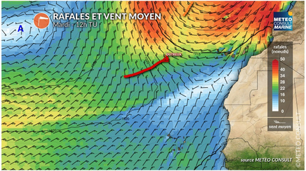 Benjamin Dutreux naviguera suffisamment loin de la dépression pour ne pas subir de conditions trop musclées. Il évoluera dans un vent de nord-ouest d’une vingtaine de noeuds qui lui permettra de progresser au reaching, à bonne allure, sur une route un peu plus sud que la trajectoire la plus directe.