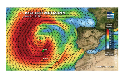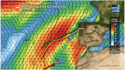 Pour Jérémie Beyou comme pour Paul Meilhat, l’objectif sera de rester le plus longtemps possible à l’avant de la dépression pour bénéficier d’un vent portant de sud-sud-ouest qui devrait perdre un peu de sa vigueur en se rapprochant du centre dépressionnaire. Le risque est de voir la dépression leur passer devant s’ils sont trop ralentis par les conditions de mer très difficiles. A l’arrière de la dépression, ils subiraient un vent de nord-nord-est soutenu qui viendrait de l’avant du bateau et contrarierait fortement leur avancée vers le Cap Finisterre.