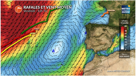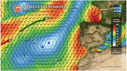Avec un vent qui sera revenu sud-sud-ouest à l’avant d’un front perturbé, Romain Attanasio aura du faire quelques empannages sur sa route et prendra une trajectoire au nord de la route directe vers les Sables d’Olonne. Il devra opter pour une trajectoire qui lui permettra de traverser la dorsale au niveau le plus étroit possible pour éviter d’être ralenti trop longtemps.