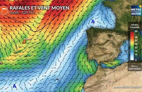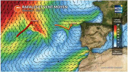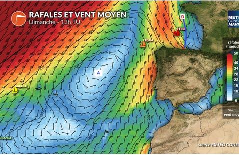Guirec Soudée continuera sa remontée vers la mer d’Iroise au travers dans un flux d’est-sud-est de 25 noeuds qui lui permettra d’incurver progressivement sa trajectoire vers la pointe bretonne.