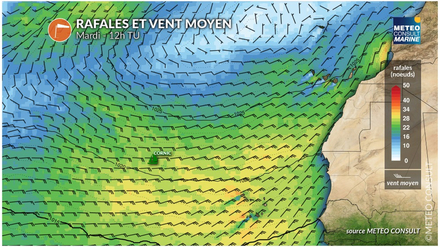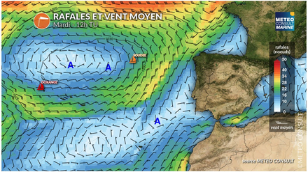 Ce mardi, Guirec Soudée se situe en bordure Est de l’anticyclone des Açores sous un vent de nord modéré. Avec la remontée de l’anticyclone vers le nord, le vent va s’orienter au secteur nord-est, obligeant le marin à mettre un cap à l’est-sud-est et donc à rallonger sa route pour conserver de la vitesse. La mer est forte avec des vagues de 4 m mais comme elles viennent de l’arrière du bateau et ne contrarie pas l’avancée du skipper.