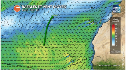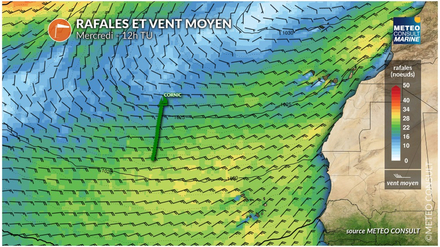 Antoine Cornic continuera sa remontée vers le nord au reaching, dans un alizé d’est qui faiblira nettement, en approche d’une dorsale anticyclonique. Il ralentira donc progressivement en arrivant à la latitude des Canaries.