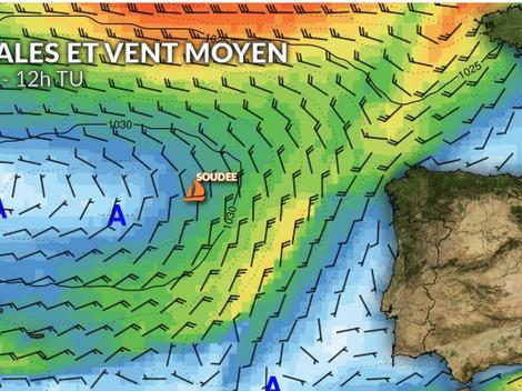 Ce mardi, Guirec Soudée se situe en bordure Est de l’anticyclone des Açores sous un vent de nord modéré. Avec la remontée de l’anticyclone vers le nord, le vent va s’orienter au secteur nord-est, obligeant le marin à mettre un cap à l’est-sud-est et donc à rallonger sa route pour conserver de la vitesse. La mer est forte avec des vagues de 4 m mais comme elles viennent de l’arrière du bateau et ne contrarie pas l’avancée du skipper.