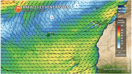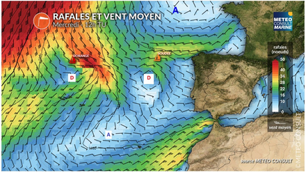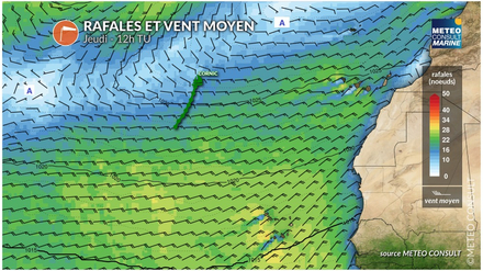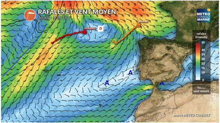 Antoine Cornic verra les conditions de vent s’améliorer après le passage de la dorsale. Un vent portant de sud-ouest se mettra en place à l’avant d’un front qu’il devrait traverser dans l’après-midi, avec une rotation du vent au nord-ouest, favorable pour reprendre une route directe vers le golfe de Gascogne.