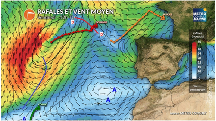 Violette Dorange est proche d’une une dépression qui la poursuit. Ses vents d’est sont très instables. Ils vont temporairement s’organiser au sud-est mais ils risquent d’être très forts (45 noeuds) au passage d’un front chaud venant du sud.