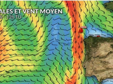 Ce samedi après-midi, Olivier Heer arrive en entrée de golfe de Gascogne et poursuit un long bord en direction de la pointe bretonne sous un vent de sud-sud-est proche de 20 noeuds. Au fil des heures, le vent s’orientera sud-est en perdant un peu d’intensité pour souffler entre 10 et 15 noeuds. Dimanche, le vent reviendra à l’est-sud-est en approche de la pointe de Penmarc’h qu’il devrait rejoindre à la mi-journée. Dans l’après-midi de dimanche, les conditions de navigation deviendront plus difficiles avec un vent irrégulier d’est-sud-est qui l’obligera à multiplier les virements de bord, au large des côtes sud de la Bretagne. C’est dans la nuit de dimanche à lundi qu’il devrait piquer vers le sud-est pour effectuer un dernier bord vers les Sables d’Olonne. Avec un vent d’est de plus en plus faible, ce n’est que dans l’après-midi de lundi qu’il devrait franchir la ligne d’arrivée.