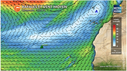 Ce dimanche après-midi, Fabrice Amedeo voit l’alizé faiblir progressivement en approche d’une dorsale anticyclonique qui lui barre la route et le fait nettement ralentir. Avec l’arrivée d’un front froid peu actif par le nord dans la nuit de dimanche à lundi, il devrait profiter d’un petit regain d’air. Ce lundi, avec un vent qui s’orientera au nord-nord-est en soufflant entre 7 et 10 noeuds, il débutera un long bord vers l’est et progressera babord amure à une vitesse de 6 à 8 noeuds.